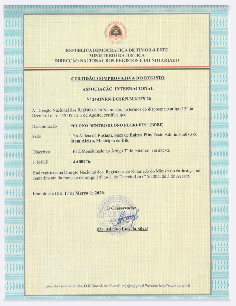 La nostra Associazione è ora ufficialmente registrata presso i Ministeri competenti di Timor Est. Un passo importante che apre il ramo timorese di Buono Dentro Buono Fuori.